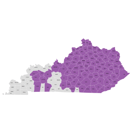 Adair, Anderson, Ballard, Barren, Bath, Bell, Boone, Bracken, Breathitt, Breckinridge, Bullitt, Campbell, Carlisle, Carroll, Carter, Casey, Christian, Cumberland, Elliott, Estill, Fayette, Gallatin, Garrard, Grant, Graves, Green, Hardin, Harlan, Harrison, Hart, Henry, Hickman, Hopkins, Jefferson, Jessamine, Kenton, Knott, Laurel, Letcher, Lincoln, Livingston, Logan, Madison, Magoffin, Marion, McCracken, McCreary, McLean, Meade, Menifee, Metcalfe, Montgomery, Muhlenberg, Nelson, Nicholas, Ohio, Oldham, Owsley, Pendleton, Powell, Pulaski, Rockcastle, Rowan, Russell, Shelby, Spencer, Taylor, Trimble, Wayne, Webster, Whitley, Wolfe and Woodford