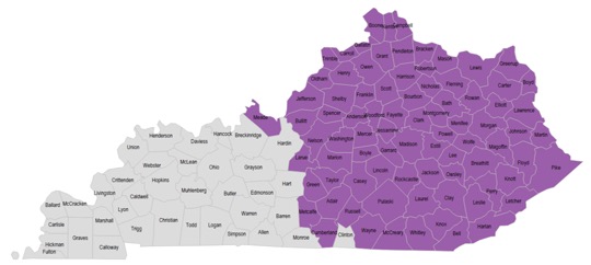Adair, Anderson, Ballard, Barren, Bath, Bell, Boone, Bracken, Breathitt, Breckinridge, Bullitt, Campbell, Carlisle, Carroll, Carter, Casey, Christian, Cumberland, Elliott, Estill, Fayette, Gallatin, Garrard, Grant, Graves, Green, Hardin, Harlan, Harrison, Hart, Henry, Hickman, Hopkins, Jefferson, Jessamine, Kenton, Knott, Laurel, Letcher, Lincoln, Livingston, Logan, Madison, Magoffin, Marion, McCracken, McCreary, McLean, Meade, Menifee, Metcalfe, Montgomery, Muhlenberg, Nelson, Nicholas, Ohio, Oldham, Owsley, Pendleton, Powell, Pulaski, Rockcastle, Rowan, Russell, Shelby, Spencer, Taylor, Trimble, Wayne, Webster, Whitley, Wolfe, and Woodford