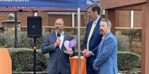 David Donohue, president of CareSource PASSE, presents a 2024 Heart of the Community Award to Ron Ekstrand, CEO of Easterseals Arkansas, and Brad Hagan, vice president of adult services at Easterseals Arkansas, for their recent work developing the Roommate Housing program. (Photo: CareSource)